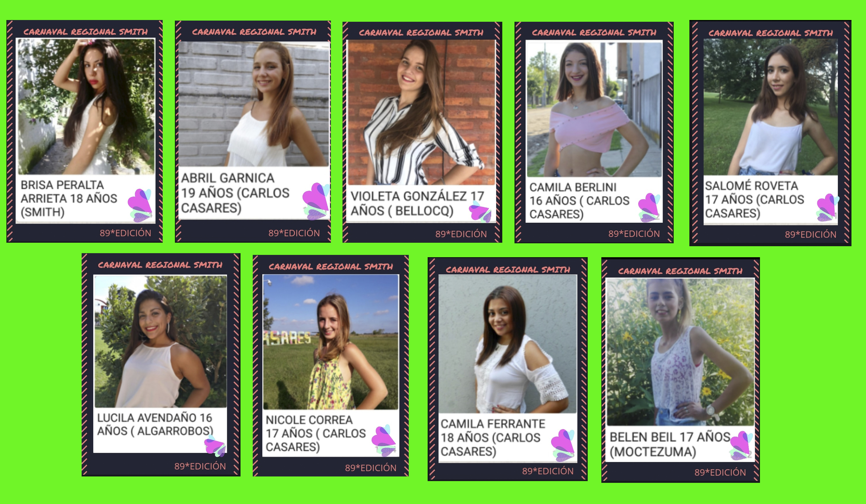 En total hay 9 postulantes, de las cuales una tendrá el honor de resultar electa. Ellas son: