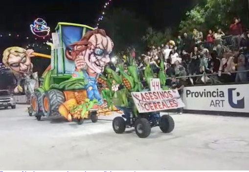 En este sentido en la noche de este último sábado 2 de marzo un asistente pudo captar con su celular en modo de video el paso de la carroza número 44, con una consigna que generó un fuerte malestar en la comunidad agropecuaria, donde se puede leer “Asesinos Cereales”, y se trata de un carro y un cuatriciclo, donde se exhibe un cultivo de maíz, y detrás una cosechadora y sobre la misma el muñeco “Chuky”.