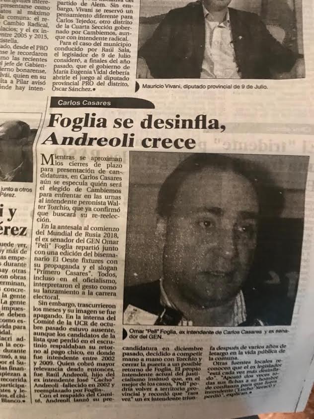 En dichos escritos se hace mención incluso a un fixture que fue repartido en una edición de El Oeste en ocasión del Mundial Rusia 2018, en el cual con la foto del exsenador Foglia aparecía el slogan «Primero Casares» en inequívoca intención de mostrarlo a Foglia como futuro candidato a intendente casarense. El medio que llegó a nuestra manos, La Voz de Bragado, manifiesta que la imagen de Foglia se fue apagando, lo ubica lejos del radicalismo y señala el respaldo obtenido por el joven dirigente Raúl Andreoli, recientemente electo titular de la UCR local, a quien le aseguran el respaldo del comité «decidido a competir mano a mano con Torchio y cerrar la puerta a un posible retorno de Foglia», dice el medio colega.