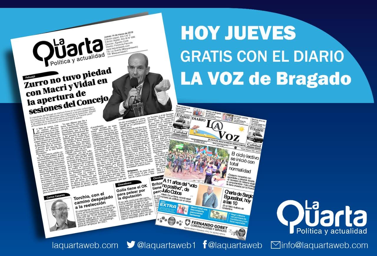 Recibimos un Banner publicitario de la inclusión del medio regional de política y actualidad La Quarta, cuya inclusión en El Oeste se estaría gestionando, en cuya tapa y grandes titulares se menciona el discurso del intendente pehuajense Zurro, quien no tuvo piedad con Macri y Vidal en la apertura de Sesiones del Concejo. En la misma página al referirse a la situación política casarense titula: «Torchio con el camino despejado a la reelección».