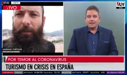 El periodista casarense Mariano Tortolini muestra en @Vivoelsábado por A24.com cómo se vive el verano en España y revela cuáles fueron las principales causas del rebrote de Covid19 en ese país. Eduardo Battaglia, conductor de dicho programa le pidió a Mariano que le cuente a la audiencia de que manera están enfrentando a éste virus y si hay temor a un rebrote de contagios.