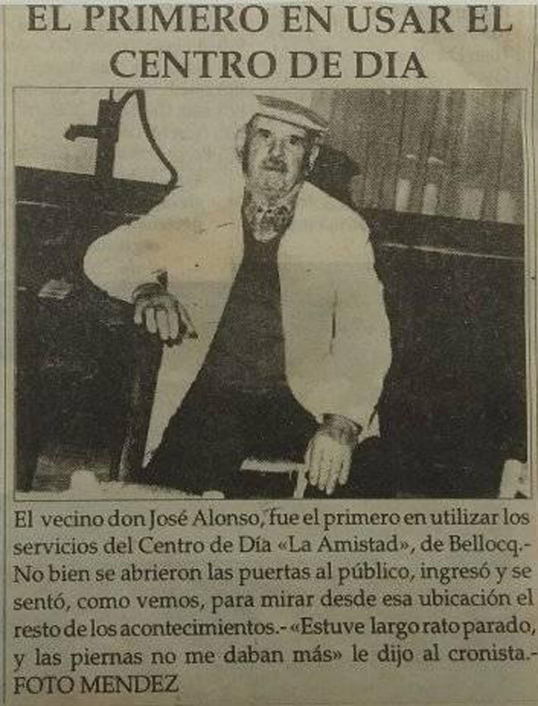 El Club “La Amistad” fue obra de la vecina Dora Elsa Constanzo, quien relataba que en el año 1990 comenzó a ver las necesidades de los abuelos, recorriendo sus casas y comprobando el estado de abandono en el que se encontraban faltos de cariño, sin familia, sin recursos, cocinando afuera con leña en días de lluvia y frio, en viviendas precarias deambulando sin tener dónde ir ni con quién estar. Fue allí viendo esa dolorosa realidad que le nació la idea de mejorar su calidad de vida en la Tercera Edad. Fue así que –relata Dora Constanzo que se juntaron con otras personas amigas y conocidas, con quienes compartía la inquietud de hacer algo por esos abuelos necesitados. Para esto contaron con el apoyo de las autoridades (no monetario) para cumplir lo que todavía era un sueño. Comenzaron su trabajo en una casa cedida, recolectaron remedios, alimentos y todo lo necesario para esos ancianos, a los que comenzaron a dar de comer y atender. “Hacíamos de todo, kermeses, juegos de mesa, eventos deportivos, venta de empanadas y golosinas, todo lo que pudiera brindarnos unos pesos con los cuales continuar la obra. Los ancianos eran cada vez más y debíamos darle de comer todos los días. En 1993 debieron alquilar una casa porque la que tenían les resultaba chica, eran 30 los abuelos que acudían a nuestro club “. El 6 de junio de 1994 resolvieron crear oficialmente el Club “La Amistad” Tercera Edad Bellocq, cuyos postulados son: