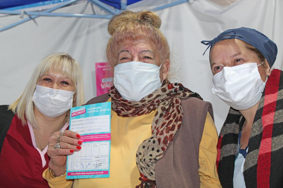 Este martes en el vacunatorio que funciona en el Óvalo de la Cámara de Comercio de  nuestra ciudad, la Sra Chichi Adrover Pagano recibió su vacuna contra el covid 19 y ese mismo día cumplió sus 77 años de edad, por dicha razón las enfermeras le cantaron el Feliz Cumple Chichi muy feliz y agradecida se sintió muy emocionada. (Foto Soraya – Estudio Fogonazo Méndez)