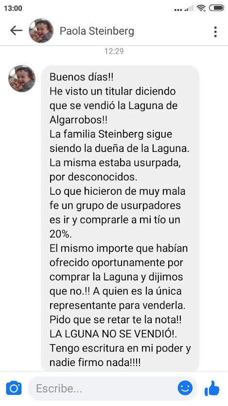 En el mismo escrito dice que «lo que hicieron de muy mala fe  un grupo de usurpadores es ir a comprarle a mi tío un 20%, el mismo importe que nos habían ofrecido por comprar la laguna y dijimos que no!!! . Nos escribe Paola Steinberg en nombre de la familia Steinberg.