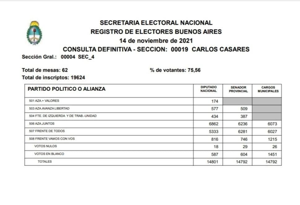 El  exintendente y ex-senador Omar “Peli” Foglia nos hizo llegar una copia de la Secretaria Electoral Nacional – Registro de Electores Buenos Aires- Consulta Definitiva Sección  00019 Carlos Casares.