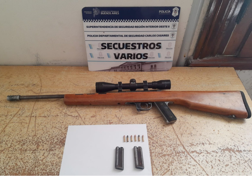 Con fecha 05, se recepciona un llamado al abonado de Emergencias 101 de esta Policía, dando cuenta la sustracción de un arma de fuego de su propiedad, la cual poseía en la localidad de Ordoqui. Luego que el personal Policial se interiorizada de este elemento comienza el relevamiento sobre caminos rurales aledaños a dicha localidad, dando con una persona de sexo masculino identificado como OJEDA LAZARO MANUEL (22) sobre camino real al acceso a la localidad de Cadret, constatando en su poder sobre este masculino arma de fuego tipo carabina calibre 22, marca Mahely, con mira telescópica, la que fue sustraída instantes atrás y denunciada por la víctima. Masculino aprehendido a disposición de la Justicia, quien avaló lo actuado, interviniendo en esta oportunidad la Unidad Funcional de Instrucción n° 2 a cargo del Dr., BUTTI Martin del Depto. Jud. Trenque Lauquen.-