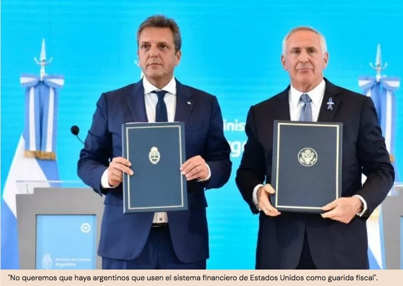 El día Lunes 05 de diciembre el ministro de Economía, Sergio Massa firmó con el gobierno de los Estados Unidos el acuerdo de intercambio de información que le permitirá acceder de manera automática a los datos de cuentas bancarias y de inversión financiera de argentinos no declaradas en el país del norte.