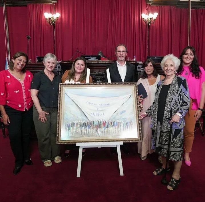 Con la presencia de Estela de Carlotto y Herenia Sánchez Viamonte, el cuerpo legislativo mantuvo este jueves un emotivo encuentro en el recinto de la Legislatura Provincial, donde se entronizó el emblemático pañuelo blanco, símbolo característico de la lucha por los Derechos Humanos que tanto las Madres como las Abuelas vienen dando desde hace 47 años. La obra, realizada por el artista plástico Sergio Tosoratti, estará exhibida permanentemente en una de las paredes de la Cámara.