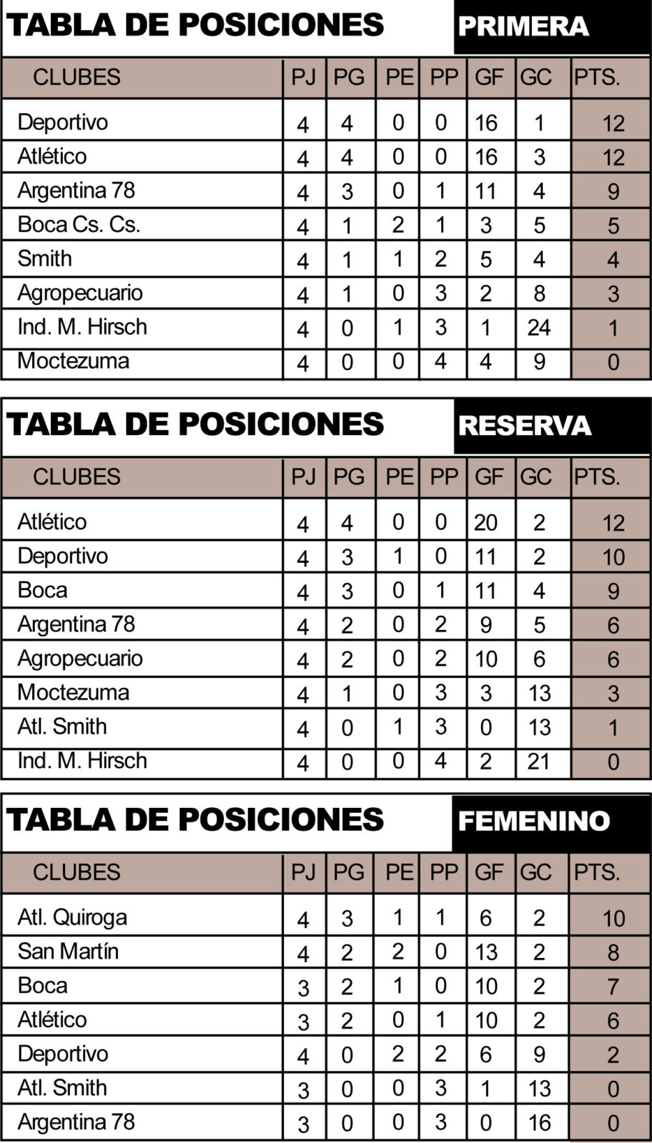 El sábado se jugó la cuarta fecha del torneo en cancha de Agropecuario donde sumaron de a tres Boca, Quiroga y San Martín y con éstos resultados el equipo quiroguense se adueñó de la punta de la tabla.