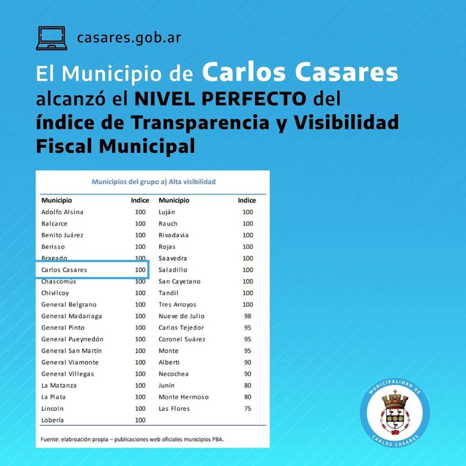 Tras el relevamiento de la Asociación Argentina de Presupuesto y Administración Financiera Pública (ASAP), nuestro municipio alcanzó el nivel perfecto y entró entre los municipios que totalizaron los 100 puntos del índice de transparencia.