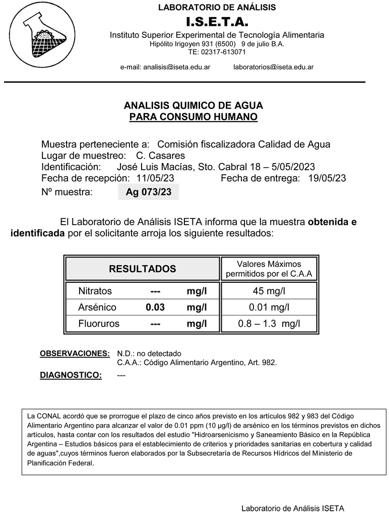 Después de dos análisis con bajos tenores de arsénico volvimos a ese valor intermedio que nos pone en la duda si estamos tomando agua potable o no. Desde 2007 esperamos por el estudio “Hidroarsenisismo y Saneamiento Básico en la República Argentina”. Dicho estudio, definiría científicamente y de una vez por todas el tenor de arsénico. La falta de este estudio permite que exista un parámetro a nivel nacional y otro a nivel provincial. Esto no hace más que dificultar y problematizar una decisión tan simple como ¿qué agua debemos beber?