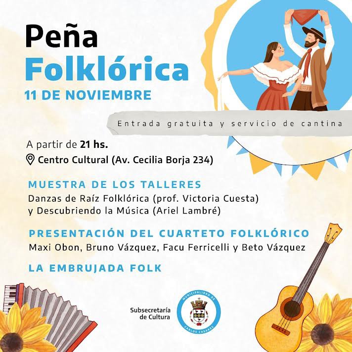 La Subsecretaría de Cultura ha organizado una gran peña folklórica para el próximo 11 de noviembre a partir de las 21 horas en el Centro Cultural, ubicado en Cecilia Borja 234.