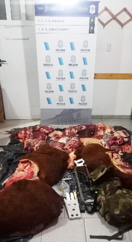 Siguiendo con el relato y al observar en la caja de carga de dicha pick up, notamos que había un animal faenado.- Seguidamente procedemos a dar aviso a la Fiscalía Interviniente y Ayudantía Fiscal Local quienes imparten directivas a seguir.- Se procede al SECUESTRO de la pick up antes mencionada, juntamente con 8 bolsas de consorcio con cortes de carne (300 kg aprox) correspondiente de la faena de un animal de raza Aberdeen Angus colorado, una sierra de mano, cuchillas, ganchos, dos Handyes, municiones calibre 22 y una linterna.- Se labran actuaciones caratuladas ABIGETO donde resulta victima BELTRAN Omar con intervención de la UFI Nro. 3 a cargo del Dr. ARCOMANO Favio y Ayudantía Fiscal Carlos Casares a cargo del Dr. GRACIANO Roberto ambos dependientes del Dpto. Jud. Trenque Lauquen. – Para con imputados se esperan nuevas medidas Judiciales. –