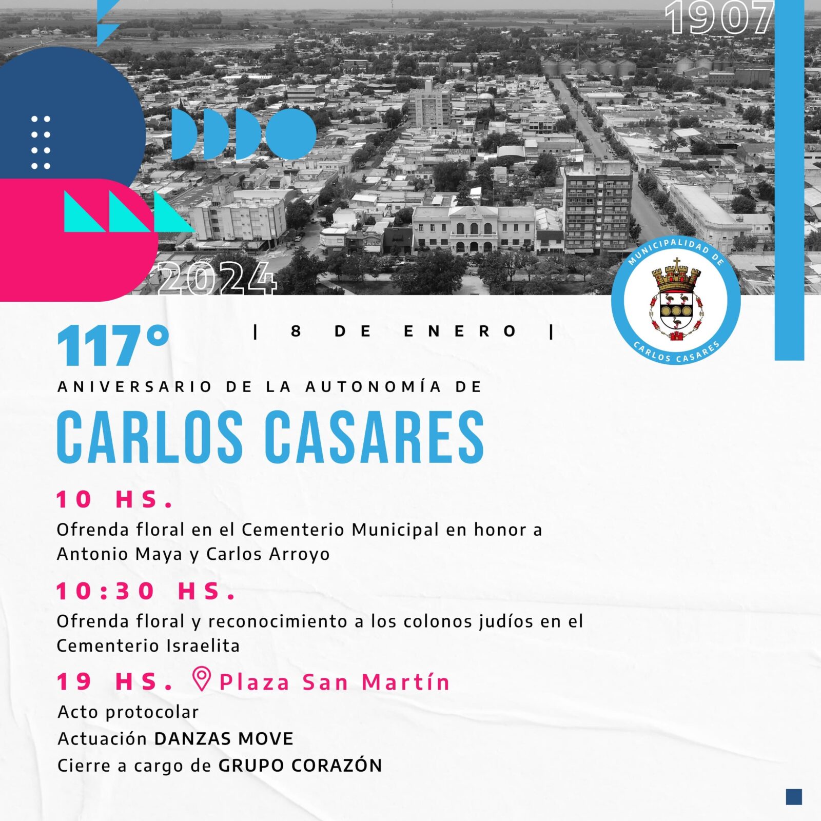 Este lunes 8 de enero, Carlos Casares cumple sus 117 años y la Municipalidad invita a los vecinos a celebrarlos en el corazón de la ciudad, más precisamente en nuestra plaza San Martín, donde podremos compartir un día de mucha música y danzas con la actuación de Danzas MOVE y el cierre en vivo de Grupo Corazón.