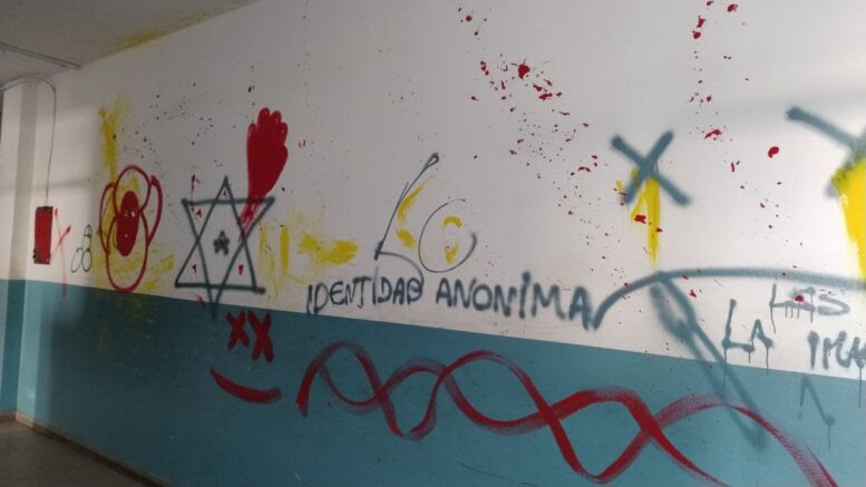 El miércoles fue un día muy feo para las autoridades del Colegio Nacional, ya que cuando ingresaron al establecimiento se encontraron con la terrible sorpresa de que todas las paredes, al igual que los baños habían sido escritos con insultos a las autoridades, e incluso habían dibujado la Estrella de David y una cruz Esvástica, acompañadas con leyendas como «Colegio Nazi» y varias más.