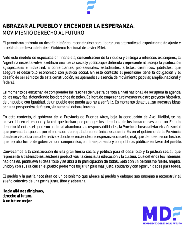 El gobernador bonaeren-se Axel Kicillof lanzó el sábado pasado el  “Movimiento Derecho al Futuro” (MDF), su nuevo espacio político con el apoyo de decenas de dirigentes peronistas bonaerenses. Allí, plantean “la construcción de una gran fuerza social y política para el desarrollo y la justicia social, que represente a trabajadores, sectores productivos, la ciencia, la educación y la cultura”.